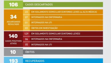 A Secretaria de Saúde informa que nesta sexta (26) acrescentou 16 pessoas POSITIVAS ao quadro de acompanhamento, por meio de testes rápidos realizados