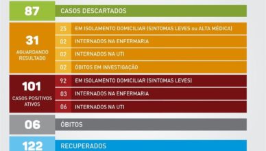 A Secretaria de Saúde informa que nesta terça (08) acrescentou 07 casos POSITIVOS ao quadro de acompanhamento, por meio de testes rápidos realizados