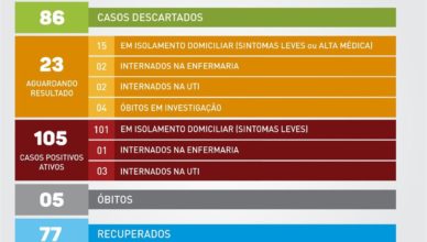 A Secretaria de Saúde informa que nesta terça (02) não foram adicionados casos positivos ao quadro de acompanhamento. Quatro testes foram realizados pela