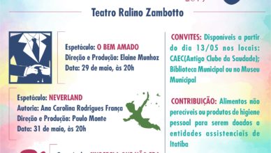 Alunos da rede municipal de ensino apresentam peças teatrais em Itatiba maio 17, 2019admin Alunos do Projeto Teatro Arte Vida, da Secretaria de Educação da Prefeitura de Itatiba, apresentam em 29 e 31 de maio, e 2 [...]