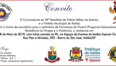 A Prefeitura de Itatiba, juntamente do 49º Batalhão da Polícia Militar do Interior, convidam para a cerimônia de Formatura do Proerd (Programa Educacional