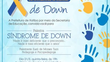 A Prefeitura de Itatiba, por meio da Secretaria de Educação, convida para a Palestra em Conscientização ao Dia Internacional da Síndrome de Down,