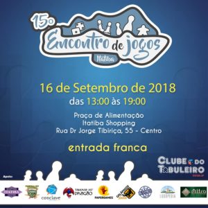 O 15º Encontro de Jogos de Itatiba acontece no domingo, 16 de Setembro de 2018 das 13h as 19h na Praça de Alimentação do Itatiba Shopping Center. A entrada é gratuita para todas as idades, porém, crianças até 12 anos devem estar acompanhadas dos pais.
