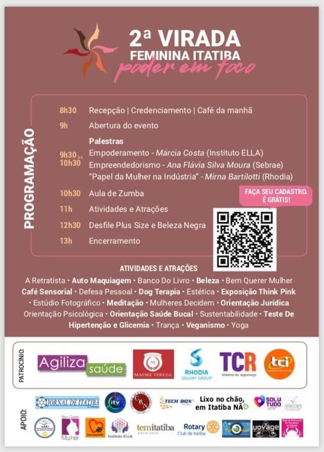 A segunda edição da Virada Feminina Itatiba está chegando. Será no próximo sábado, 27, à partir das 8h30, no Colégio Madre Tereza.