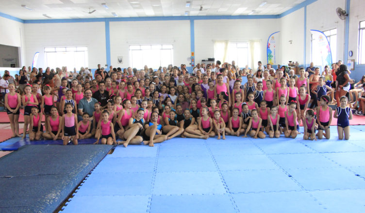 Na sequência, foi a vez das turmas de Pré Treinamento, Pré Mirim e Infantil realizarem saltos variados sobre a Mesa com mini trampolim. Em seguida, as alunas iniciantes nível I, iniciantes nível II e treinamento realizaram saltos grupados e afastados na caixa no Salto sobre o Plinto com 5 Gavetas com Jump.