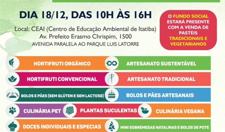 A 3ª Feira de Economia Criativa de Itatiba acontece no Ceai (Centro de Educação Ambiental de Itatiba), na avenida Prefeito Erasmo Chrispim, 1.500. Para quem não conhece o local, a avenida Erasmo Chrispim é aquela que segue paralela ao Parque Luis Latorre. No sábado, 18/12, das 10h às 16h.