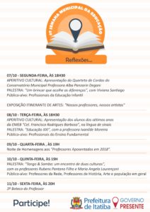 “Convidamos todos os professores e profissionais da educação das escolas publicas e particulares de Itatiba para participarem da Semana da Educação e aperfeiçoarem seus conhecimentos”, destacou Anderson Sanfins, Secretário de Educação.