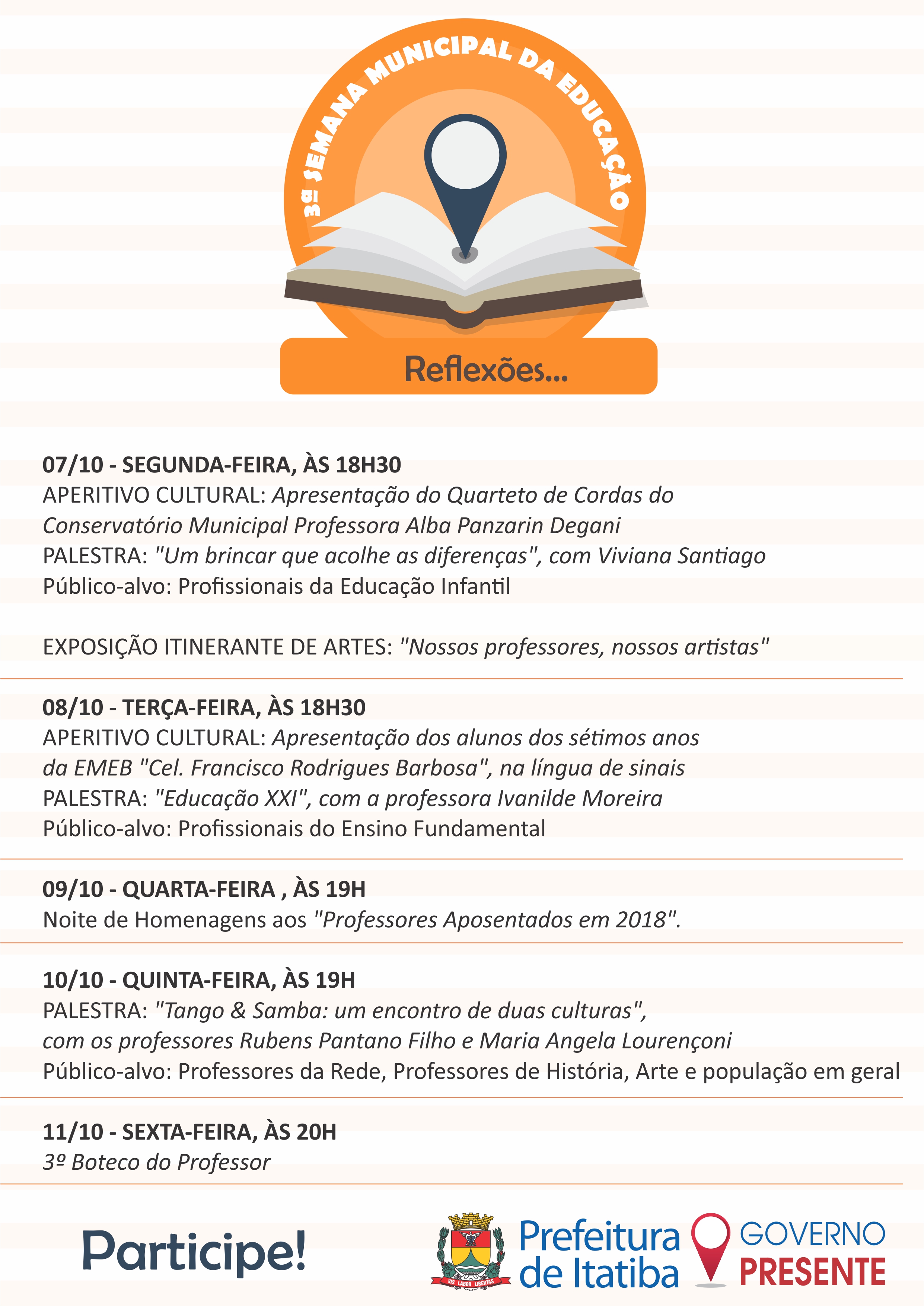 A Prefeitura de Itatiba, por meio da Secretaria de Educação, realiza a 3ª Semana Municipal da Educação, a partir da próxima segunda-feira, 07. O objetivo é oferecer formação para todos os professores e equipe escolar. Este ano o tema é “Reflexões” e todos contarão com uma série de palestras.