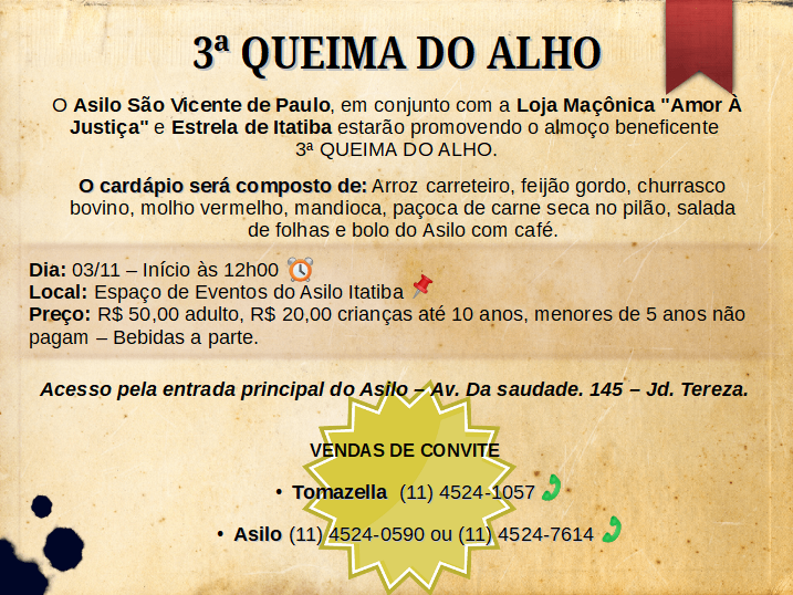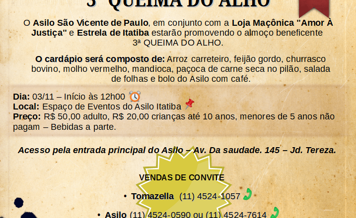 O Asilo São Vicente de Paulo em conjunto com a Loja Maçônica “Amor à Justiça” e “Estrela de Itatiba” estarão promovendo o almoço beneficente 3º Queima do Alho, no dia 03 de novembro de 2019, com início às 12h.