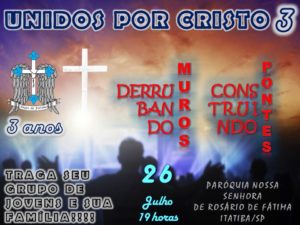 A Pastoral da Juventude Anjos de Fátima comemora 3 anos e convida toda a população itatibense a participar da celebração Unidos por Cristo 3, nesta sexta-feira, dia 26, das 19h às 23h, na Paróquia Nossa Senhora do Rosário de Fátima – no bairro Alto de Fátima, Itatiba.