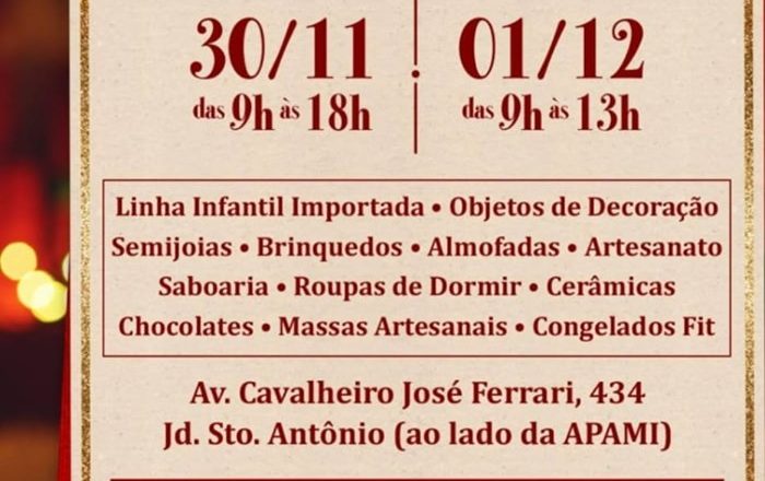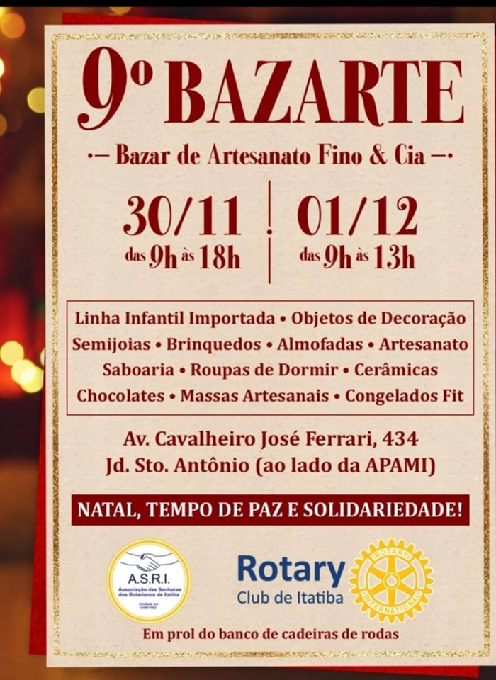 9° Bazarte – Bazar de artesanato fino & cia. novembro 25, 2019admin Neste sábado (30) e domingo (01), em prol ao banco de cadeira de rodas, toda a população está convidada a participar!
