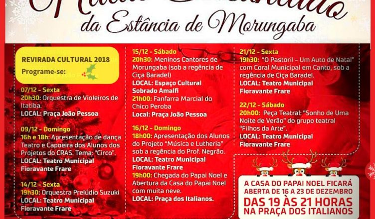 No domingo (9/12), a programação prossegue com um grande espetáculo que será apresentado em duas sessões, uma às 16h e outra às 18h. O espetáculo levará toda a magia do “Circo” com a apresentação de Dança, Teatro e Capoeira dos alunos dos projetos do Cras (Centro de Referência de Assistência Social) no Teatro Municipal Fioravante Frare.