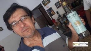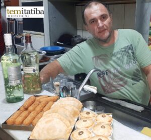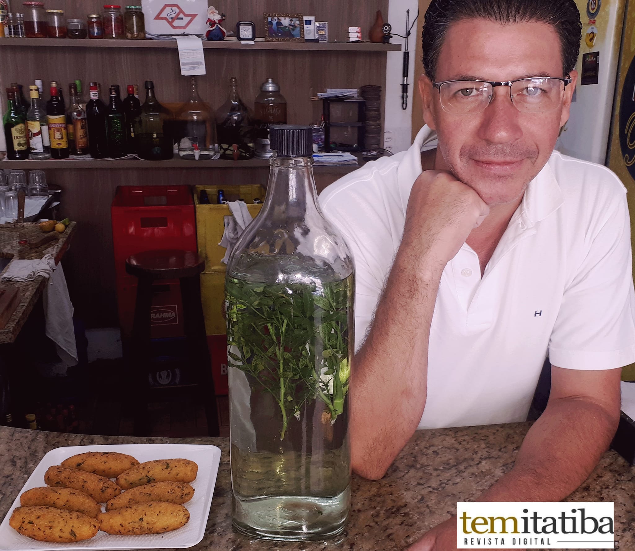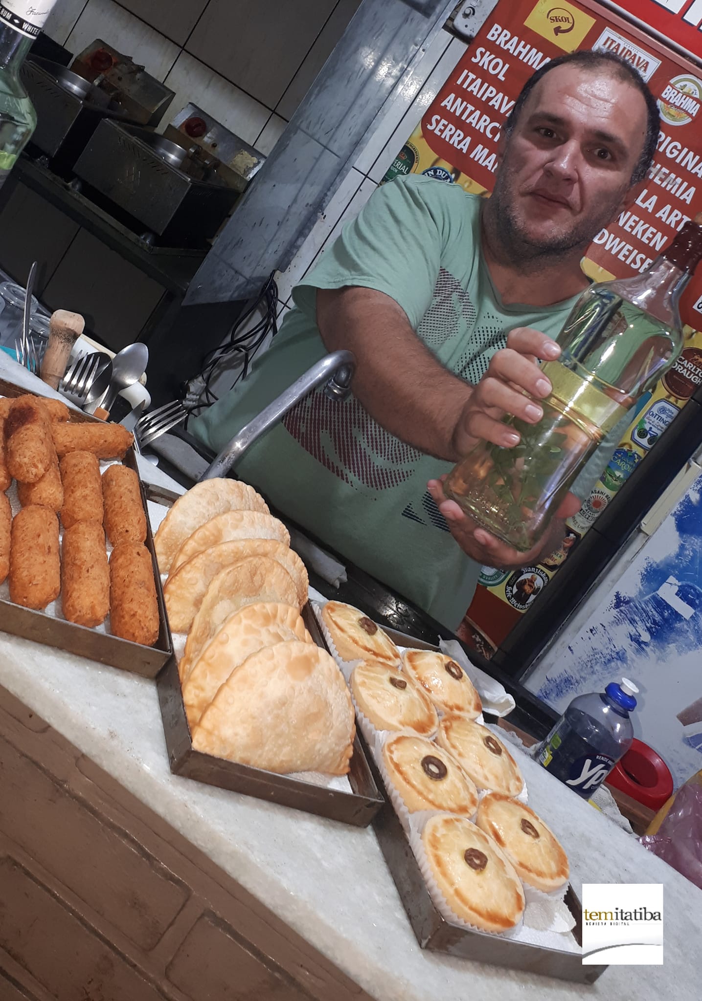 O amável Fabiano convida todos a degustar a pinga e comer o bolinho de bacalhau, pastel de queijo e palmito até às 14h
