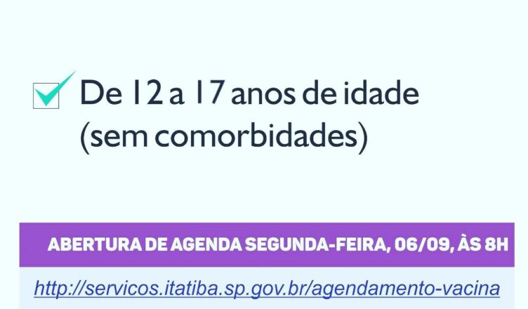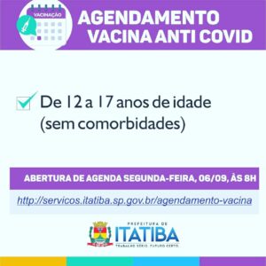 Agendamento nesta segunda-feira, 06/09 setembro 3, 2021setembro 6, 2021admin Atenção adolescentes e jovens de 12 a 17 anos. Agendamento para vacinação contra a COVID-19 em Itatiba. Cada dose é um fio de esperança. #vacinajá