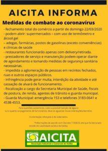 Menos de 48h depois da reunião com a diretoria da Associação Industrial e Comercial de Itatiba (Aicita), em que foi estabelecido, entre outras medidas de combate ao coronavírus, horário reduzido ao comércio a partir da segunda, a Prefeitura de Itatiba decretou o fechamento total do comércio a partir de domingo, 22 de março de 2020. No Decreto 7.358/20, da noite de sexta, 20 de março, foi declarado estado de calamidade pública, assim como também foi decretado pelos governos Federal e Estadual. Isso porque cabe ao município a adoção de medidas de prevenção, controle