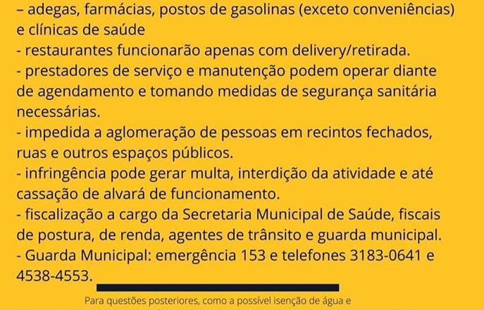 (exceto conveniências) e clínicas de saúde podem abrir. Está proibido o fornecimento de refeições para consumo in loco para os estabelecimentos voltados ao comércio de gêneros alimentícios, ficando autorizada somente a entrega e/ou retirada dos produtos pelos consumidores. Portanto, restaurantes funcionarão apenas com delivery/retirada. Prestadores de serviço e manutenção podem operar diante de agendamento e tomando medidas de segurança sanitária necessárias.