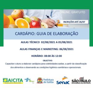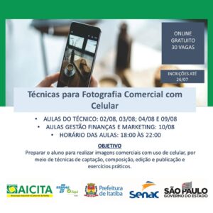 A Associação Industrial e Comercial de Itatiba (Aicita) está divulgando três ações do parceiro Sebrae Aqui Itatiba que serão realizadas de forma online e gratuita, com o objetivo sempre de orientar e capacitar empreendedores para melhor desempenho e competitividade de seus negócios e serviços. São eles: fotografia comercial com celular, organize seu salão de beleza e elabore seu cardápio.