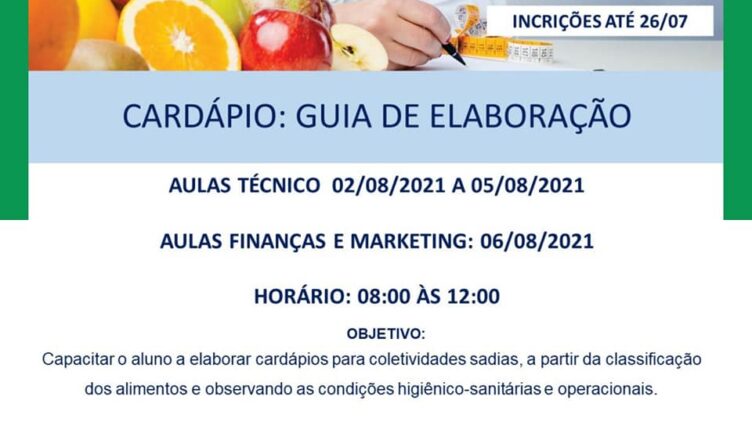O Guia de Elaboração de Cardápio será apresentado em cinco aulas. Serão quatro de conteúdo técnico, de 2 a 5 de agosto, e uma, no dia 6 de agosto, sobre finanças e marketing. As aulas serão das 8h ao meio-dia. Aqui o objetivo é capacitar o aluno a elaborar cardápios para coletividades sadias a partir da classificação dos alimentos e observando as condições higiênico-sanitárias e operacionais.