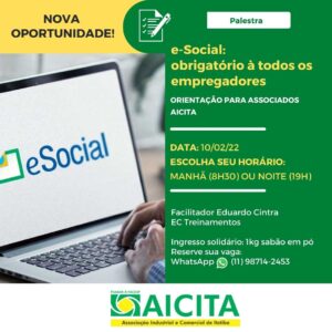 O facilitador será Eduardo Cintra, da EC Treinamentos, que atua como instrutor, professor de Ensino Técnico e consultor da Aicita na área de Segurança do Trabalho. “É importante que tenha conhecimento das obrigatoriedades legais da empresa perante o e-Social. Muitos desconhecem e estão sujeitos a multas. Por isso que a Aicita e a EC Treinamentos realizarão no dia 10 o encontro onde empregadores e representantes receberão esclarecimentos desta legislação trabalhista”, comentou Eduardo, convidando principalmente escritórios e assessorias contábeis, que podem estender o convite aos clientes.