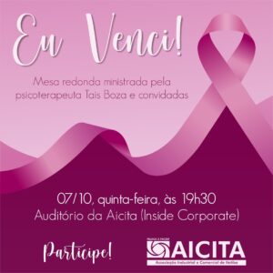 A Associação Industrial e Comercial de Itatiba (Aicita), através de seu Conselho da Mulher Empreendedora, irá promover na próxima semana o evento Eu Venci!, uma roda de conversa sobre superação em diversas áreas. A ação será em homenagem ao Outubro Rosa, movimento internacional de conscientização para o controle do câncer de mama. A entidade, no entanto, busca uma forma além de falar sobre o tema, já que a saúde da mulher vai além dos exames.