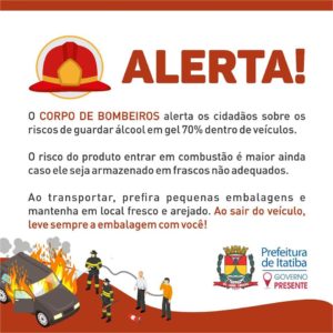 O Corpo de Bombeiros alerta sobre os riscos de guardar álcool em gel 70% no interior de veículos.