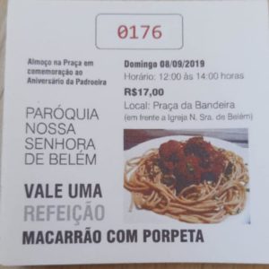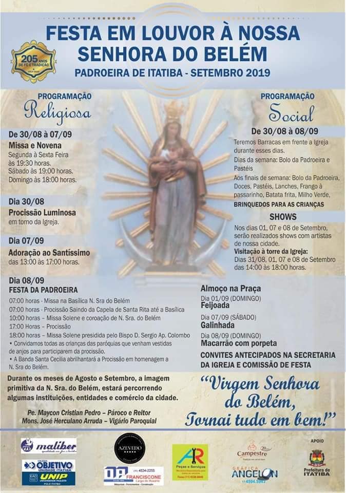 Conforme estamos divulgando no Tem Itatiba, como parte da programação social da Festa em Louvor a Nossa Senhora do Belém, a comissão de festas estará preparando o Almoço na Praça , nos dias 01/09 (Feijoada), 07/09 (Galinhada) e 08/09 (Macarrão com Porpetas). Os convites já estão sendo vendidos na secretaria da igreja e com os voluntários.