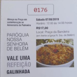 Um dos organizadores da festa, Douglas Dutra, nos enviou a foto da deliciosa Galinhada, iguaria que leva em sua composição arroz, cebola, alho, tomate, pimentões vermelho e verde, galinha caipira, limão e cheiro verde salpicado na finalização. O valor da farta porção sai por R$ 17,00 e será servido no sábado, dia 07/09, das 12h às 14h, na Praça da Bandeira em frente à igreja.(Informações sobre venda de convites para o almoço: 11- 4538 0208)