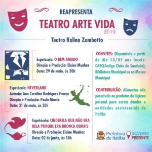 Alunos do Projeto Teatro Arte Vida, da Secretaria de Educação da Prefeitura de Itatiba, apresentam em 29 e 31 de maio, e 2 de junho, três espetáculos teatrais gratuitos no Teatro Ralino Zambotto.