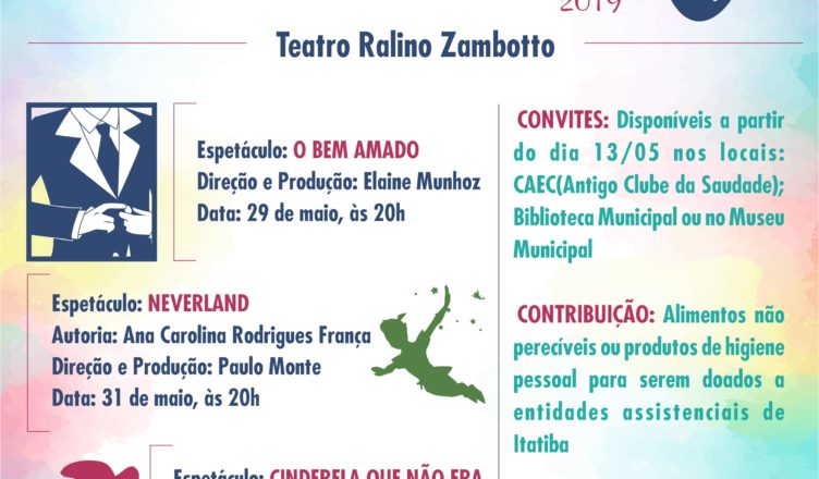 Em 29/05, às 20h, será apresentada a peça “O Bem Amado”, com produção e direção de Elaine Munhoz. Já em 31/05, às 20h, é a vez do espetáculo “Neverland” de autoria de Ana Carolina Rodrigues França e direção de Paulo Monte. Em 02/06, também às 20h, será encenada a peça “Cinderela que não era bela porque era bronca demais”, de Elaine Munhoz.