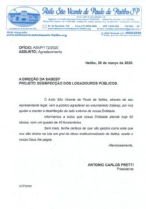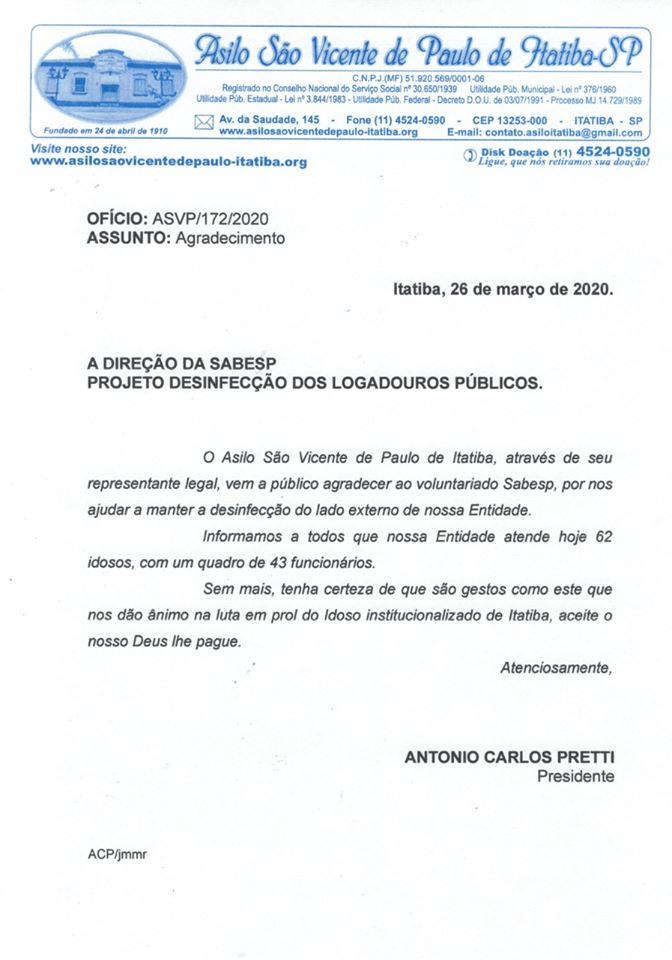 Ofício de agradecimento do Presidente do Asilo São Vicente de Paulo, Sr Antônio Carlos Pretti, à Direção da Sabesp .