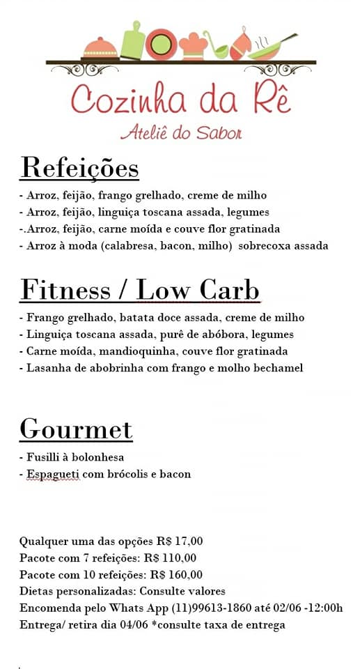 Ateliê do Sabor maio 31, 2021admin Não cozinhe! Peça o cardápio da Cozinha da Rê, o Ateliê do Sabor. Sabor, por sinal, maravilhoso ! E preço que cabe no bolso, experimente! Whatsapp 11- 99613- 1860 Encomendas até quarta-feira, 02 , ao meio dia . **Divulgação Tem Itatiba **.