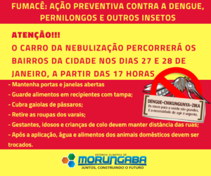 A equipe do Departamento de Saúde da Prefeitura de Morungaba realizará a nebulização ambiental, conhecida como “fumacê”, para o combate ao mosquito Aedes aegypti, vetor de doenças como dengue, chikungunya e zika vírus, além de pernilongos e outros insetos, nos dias 27 e 28 de janeiro, a partir das 17 horas, em todos os bairros do município.
