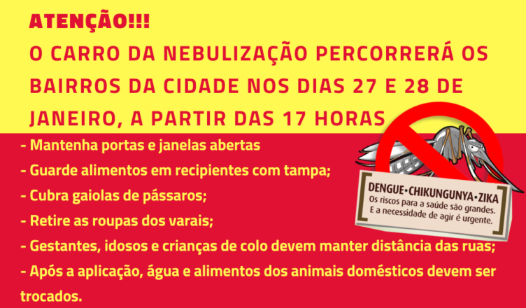 A equipe da Vigilância em Saúde vem realizando ações de combate ao mosquito rotineiramente com orientações e campanhas junto à comunidade. O produto utilizado na nebulização não é tóxico para as pessoas, porém eficiente contra o mosquito alado.