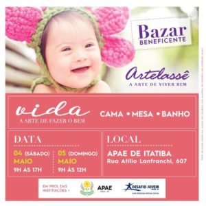 Nos dias 04 e 05 de maio será realizada mais uma edição do bazar de roupa de cama, mesa e banho da Artelassê em prol das instituições APAE e Desafio Jovem.