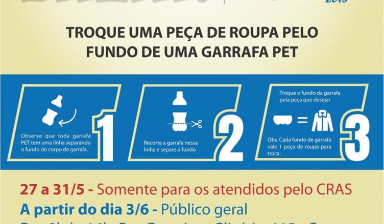 O Bazar será realizado na Rua Francisco Glicério,115, no Centro, das 9h às 16h. Basta levar o fundo de uma garrafa pet para a troca com uma peça de roupa.