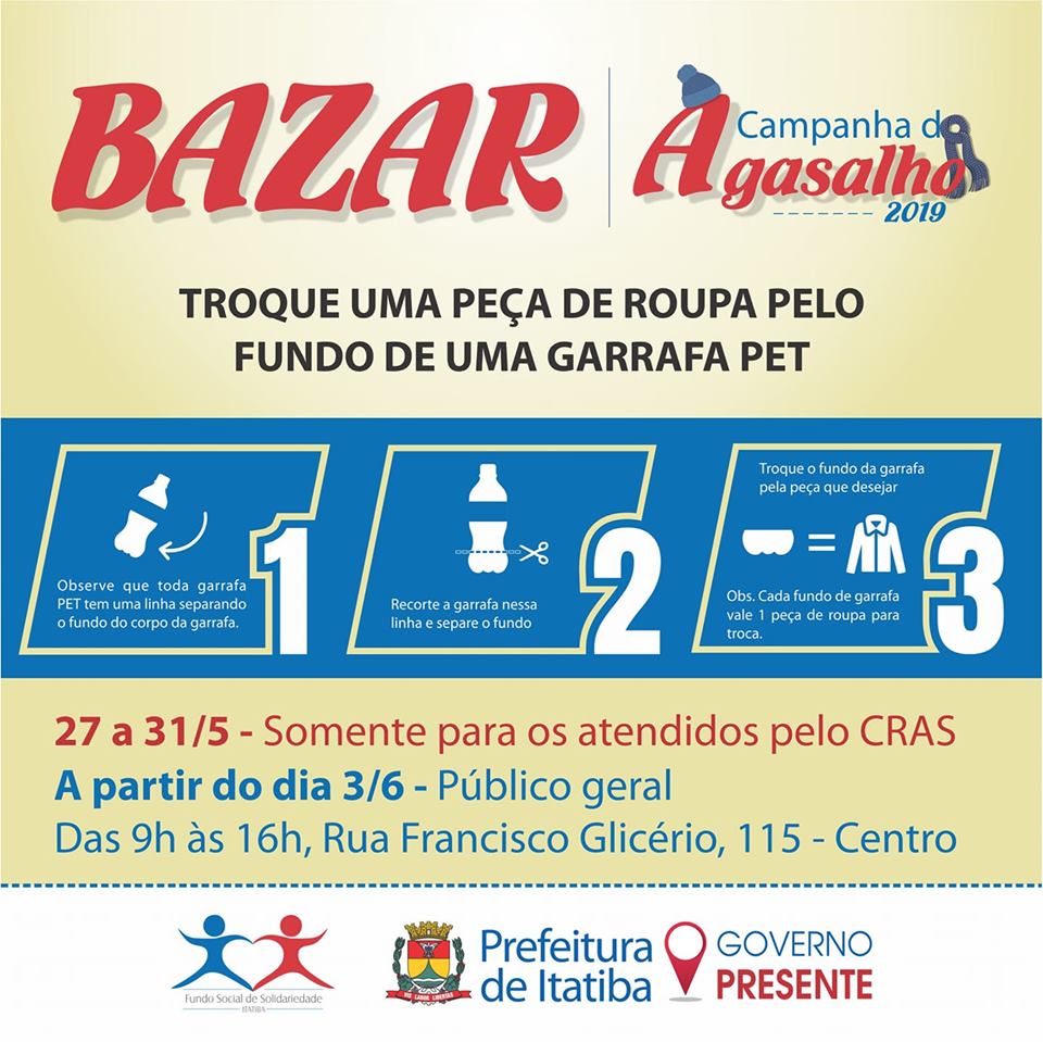 O Fundo Social de Solidariedade da Prefeitura de Itatiba abre na próxima segunda-feira, 27, o Bazar da Campanha do Agasalho. De 27 até o dia 31 de maio, o Bazar será destinado apenas para as pessoas que são atendidas pelos CRAS. A partir do dia 03 de junho, será aberto para os demais interessados.
