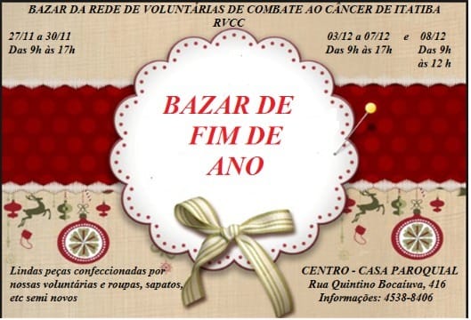 Está agendado para a próxima terça-feira, 27, o bazar de fim de ano da Rede de Voluntárias de Combate ao Câncer de Itatiba com lindas peças confeccionadas pelas voluntárias, além de roupas e sapatos semi novos.