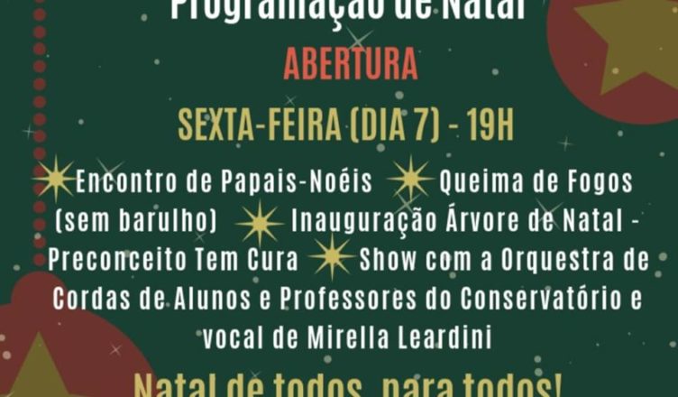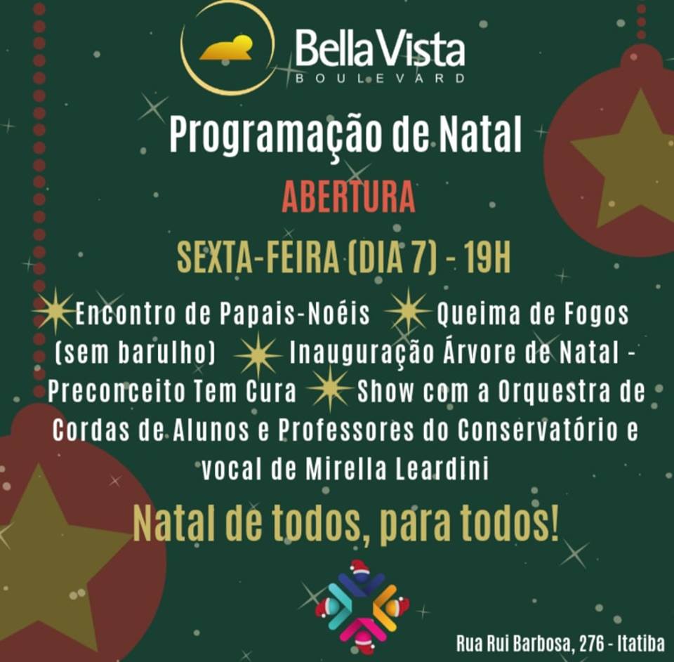 A abertura da campanha ‘Natal de todos, para todos’ acontece nesta sexta-feira, 07, às 19h. A primeira ação acontece em parceria com o Best Center Itatiba e será o Encontro de Papais Noéis. Na sequência, haverá queima de fogos (sem barulho) com baterias nos dois empreendimentos, abrindo oficialmente o calendário de ações de Natal nos centros comerciais. Às 20h, na sacada do Bella Vista, será realizada a apresentação da Orquestra de Alunos e Professores do Conservatório Municipal, com a participação da cantora cega Mirella Leardini. E para encerrar a noite, será inaugurada a árvore de Natal montada com fotos da Campanha Preconceito Tem Cura?, do fotógrafo Toninho Brunhara.