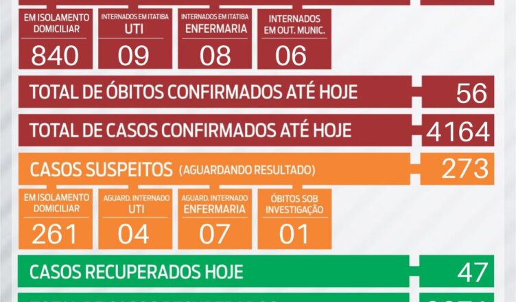 Nesta segunda-feira foram confirmadas duas mortes por Covid-19. Os óbitos aconteceram na última semana e constavam como casos suspeitos. Tratam-se de duas mulheres, de 89 anos e de 64 anos. Ambas estavam internadas na Santa Casa de Misericórdia de Itatiba e tinha comorbidades. A Prefeitura de Itatiba lamenta as perdas e deixa seus pêsames às famílias das vítimas. O município passa a contar com 56 vítimas fatais da doença e uma morte ainda segue sendo suspeita.