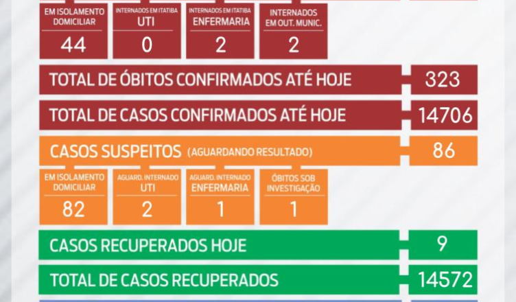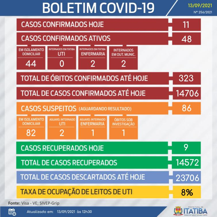O boletim desta segunda-feira, 13/09, registra 11 casos confirmados de Covid-19. Não houve o registro de mortes e a taxa de ocupação de leitos na UTI Covid está em 8%. Foram realizados 25 testes de detecção da doença e nove pessoas concluíram a quarentena.