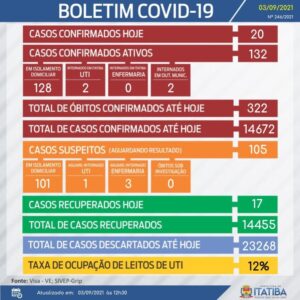 Dezessete pessoas saíram da quarentena nas últimas 24 horas, apontam os dados do boletim desta sexta-feira, 03/09. No período, foram confirmados 20 casos de Covid-19 e aplicados 50 testes para detecção do vírus. A taxa de ocupação da UTI Covid permanece em 12%.