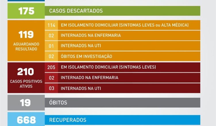 Periodicamente, a Vigilância Sanitária atualiza o número de pacientes positivos que já passaram pela quarentena. Hoje, mais 69 são considerados RECUPERADOS e podem deixar o isolamento domiciliar, sendo sempre recomendado o distanciamento social, uso de máscaras e a lavagem das mãos.