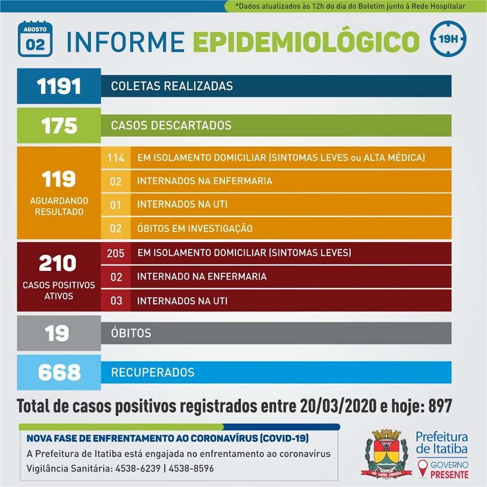 A Secretaria de Saúde de Itatiba informa que neste domingo (02/ago) acrescenta 13 casos POSITIVOS ao quadro, por meio testes privados e do “Teste Itatiba”, realizados ontem.