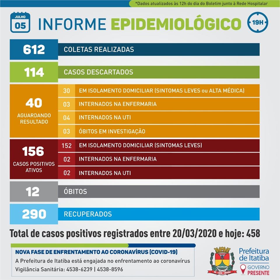 A Secretaria de Saúde acrescenta neste domingo (05/jul) três casos POSITIVOS ao quadro de acompanhamento, via testes rápidos laboratórios privados e UPA. Todos estão em casa.