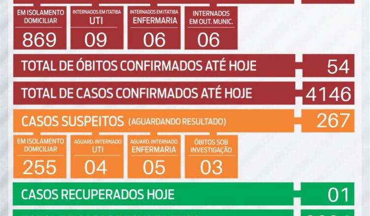 Os números da Covid-19 em Itatiba se mantiveram estáveis nas últimas 24 horas. A única alteração em relação ao dia anterior é a saída de um cidadão da quarentena, considerado recuperado.