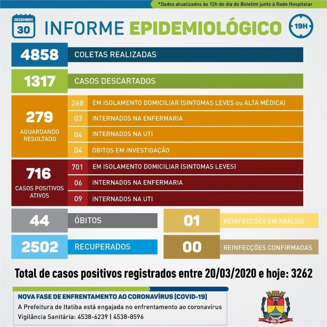 Informamos ainda que nesta quarta (30/dez) 169 novos casos foram reportados para a Vigilância Sanitária via testes privados, da Prefeitura e do Instituto Adolfo Lutz.