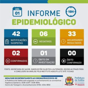A Secretaria Municipal de Saúde informa que nesta quarta (1/4) foram realizadas quatro coletas para testagem de covid-19 para o Instituto Adolfo Lutz. Nenhum novo resultado foi divulgado e aguardamos a chegada dos testes rápidos comprados pela Prefeitura: 200 testes devem chegar nesta semana e outros mil durante o mês de abril. Eles serão utilizados nos pacientes já no aguardo de resultados, pessoas próximas a testados positivos e ainda em casos relevantes nas barreiras sanitárias.