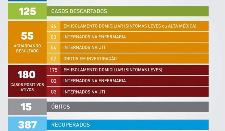 Mais 5 coletas foram realizadas para análise do Instituto Adolfo Lutz. Um paciente está na UTI, outro na Enfermaria e os demais em casa, aguardando o resultado. A Prefeitura recebeu 4 resultados positivos do Instituto. Dois já constavam no quadro via teste rápido, um estava aguardando e o quarto resultado é o óbito informado acima.