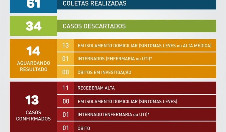 Um laboratório particular reportou que realizou um teste rápido em um homem de 54 anos, com resultado POSITIVO. Apesar do número de casos ter sido elevado a 13 casos positivos, felizmente 11 deles estão curados!