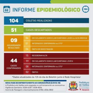 Segundo informação obtida pelo Dr. Carlos Lemes, são 03 os internados na UTI da Santa Casa para covid-19 (dois confirmados e um suspeito). Na ala de enfermaria, dos 21 leitos já reservados, 05 estão ocupados. Há ainda o caso de um homem, positivo, que esteve em UTI em Sorocaba e agora está em enfermaria em Jundiaí.